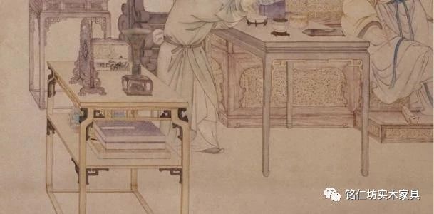 圖中數(shù)十件家具,種類完備、形制成熟,且有統(tǒng)一風(fēng)格,格調(diào)素雅、色彩渾穆、線條瘦勁,宋代家具造型與結(jié)構(gòu)的典型特點(diǎn)已蔚然可見。這一點(diǎn),后來被明式家具傳承。