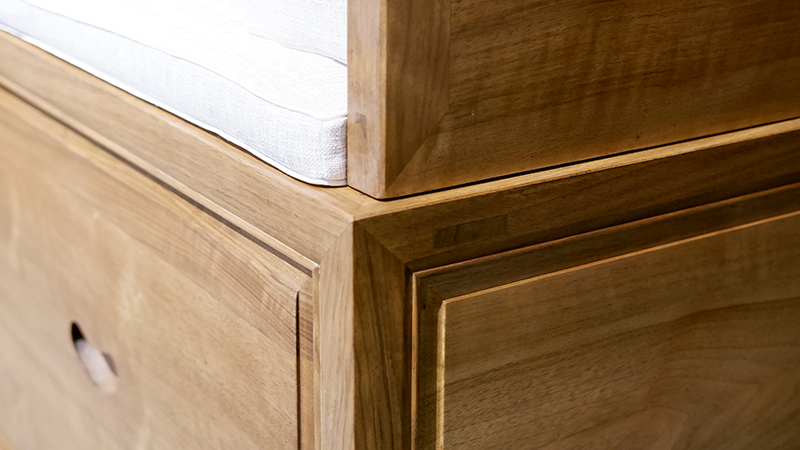 銘仁坊家具均為核桃木制作。核桃木,和道,木中君子,如玉溫潤,高古拙璞,內(nèi)斂含蓄,紋理若隱如現(xiàn),與微黃的顏色相匹配。